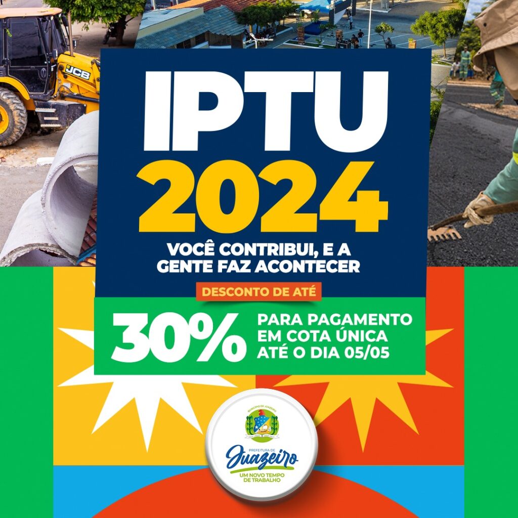 A Prefeitura de Juazeiro, por meio da Secretaria da Fazenda (Sefaz), oferece aos contribuintes a oportunidade de quitar o Imposto sobre a Propriedade Predial e Territorial Urbana (IPTU) 2024 com até 30% de desconto. Para garantir esse benefício, basta pagar o imposto em cota única até o dia 5 de maio, para contribuintes adimplentes até 31/12/2023, ou 10%, em caso de débito através do IPTU Digital disponível no site: www.juazeiro.ba.gov.br.