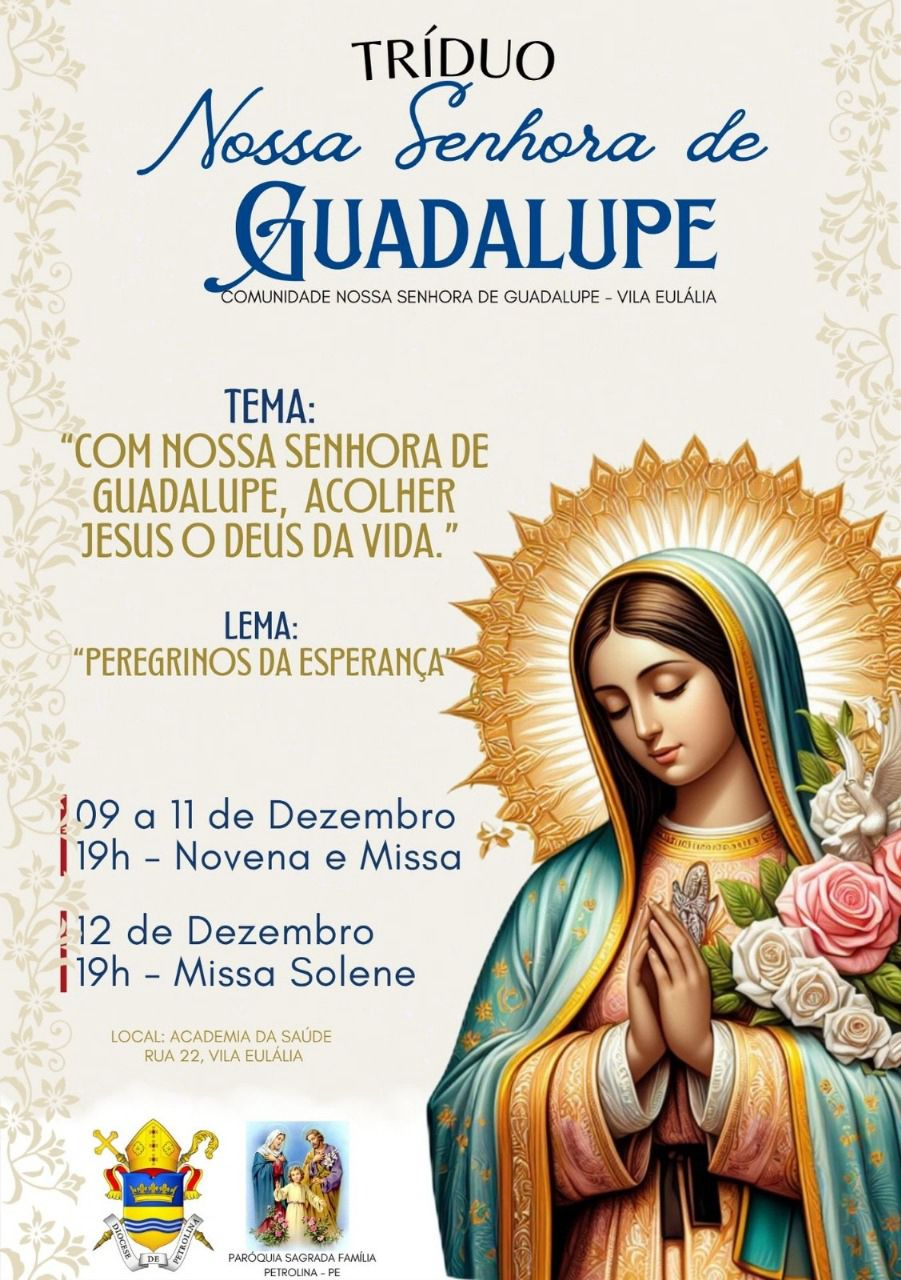 Na sexta-feira (12), dia em que toda a América Latina comemora sua padroeira, a comunidade católica da Paróquia Sagrada Família, faz o encerramento da Festa de Nossa Senhora de Guadalupe 2025, com uma missa solene às 19h30, celebrada pelo bispo emérito de Petrolina, Dom Francisco Canindé Palhano e o coral Perfume de Maria. A Academia da Saúde fica na rua 22, Vila Eulália.